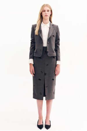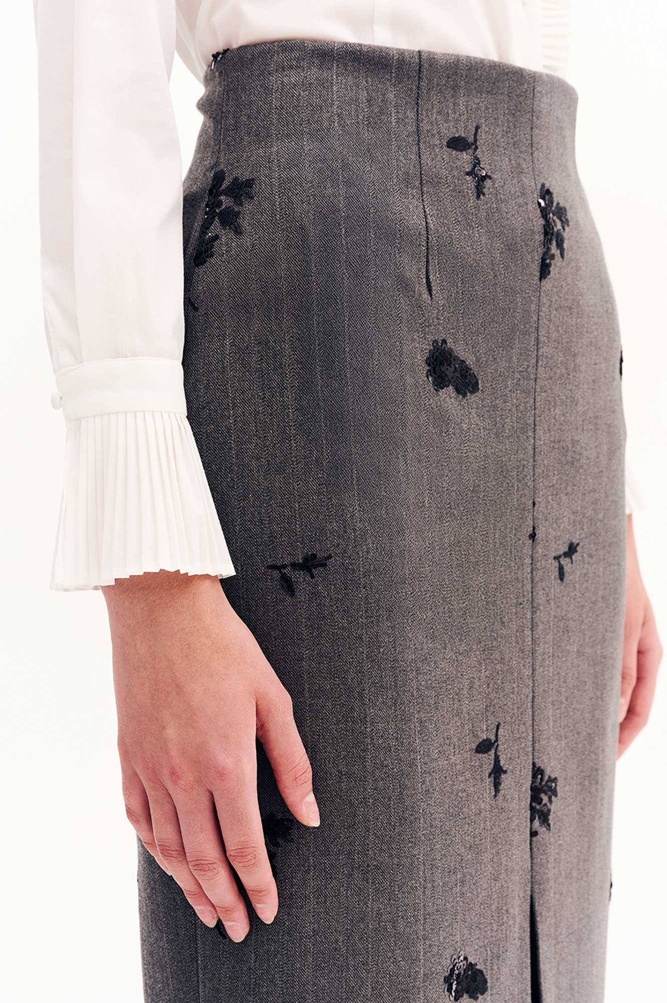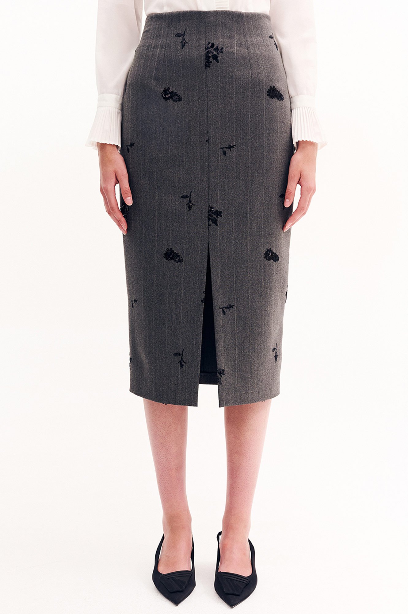 Φούστα ψηλόμεση pencil midi. Με σχέδιο λουλούδια από παγιέτα και άνοιγμα στο μπροστινό μέρος