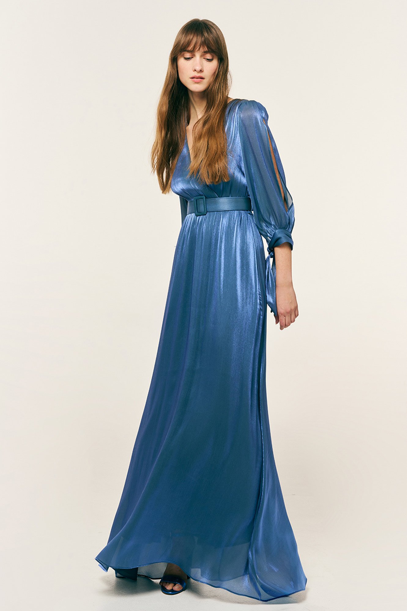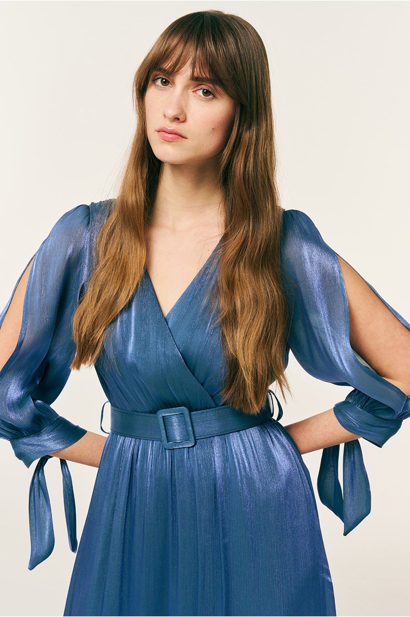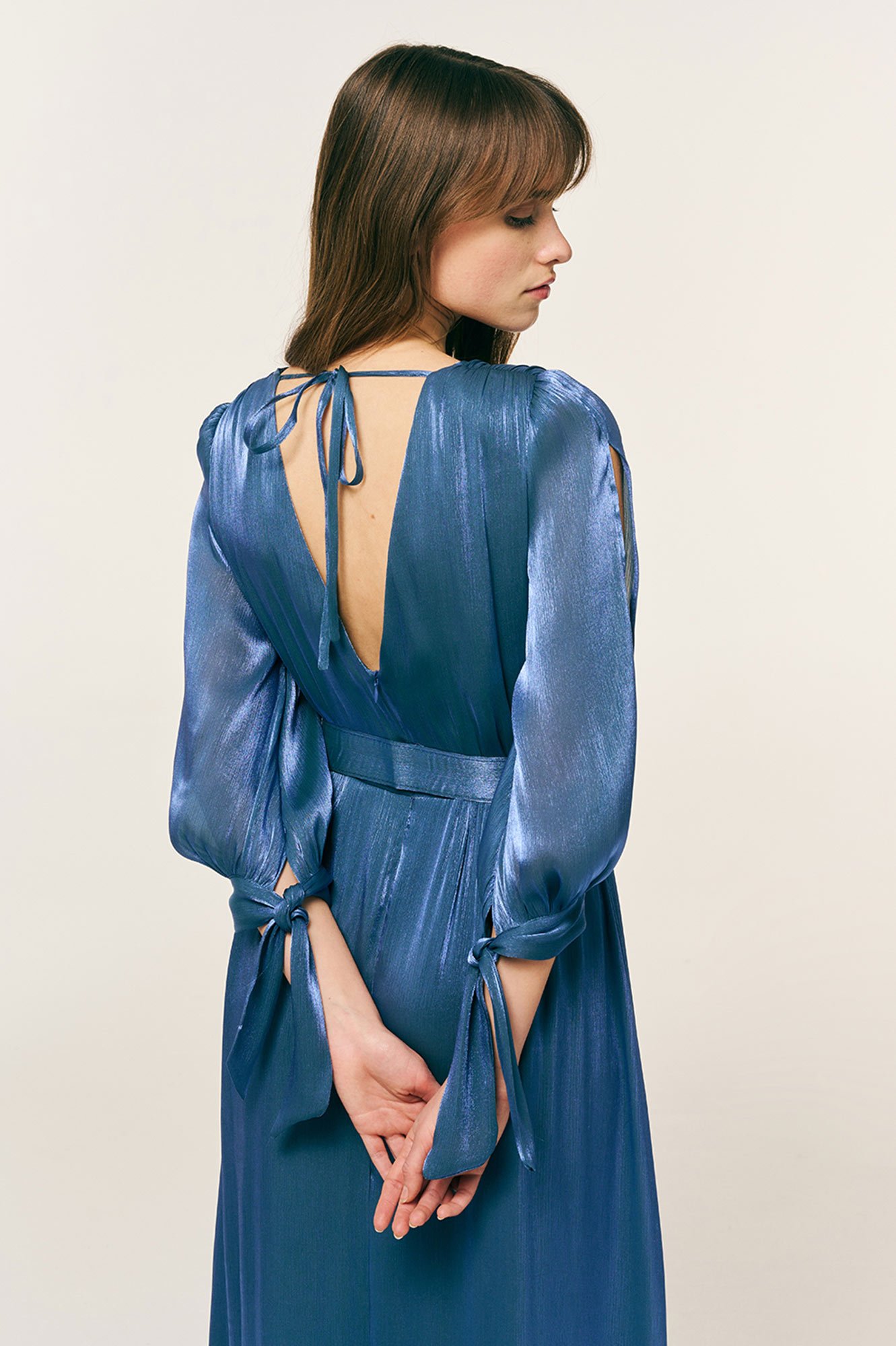 Φόρεμα μουσελίνα με μανίκια με δέσιμο. “V” λαιμόκοψη και ίδιο κόψιμο και στο πίσω μέρος με δέσιμο ψηλά και ζώνη από το ίδιο ύφασμα