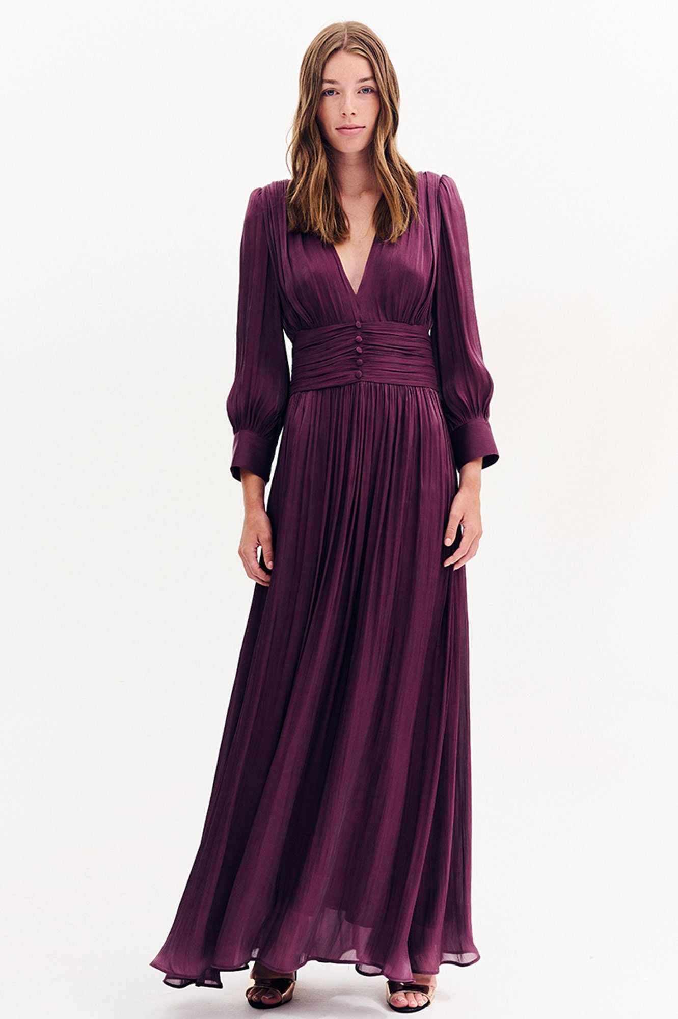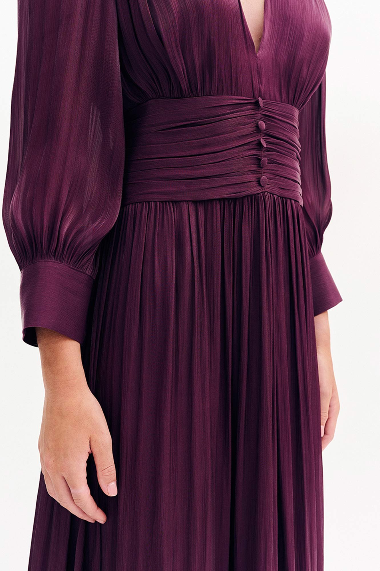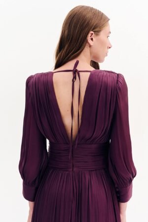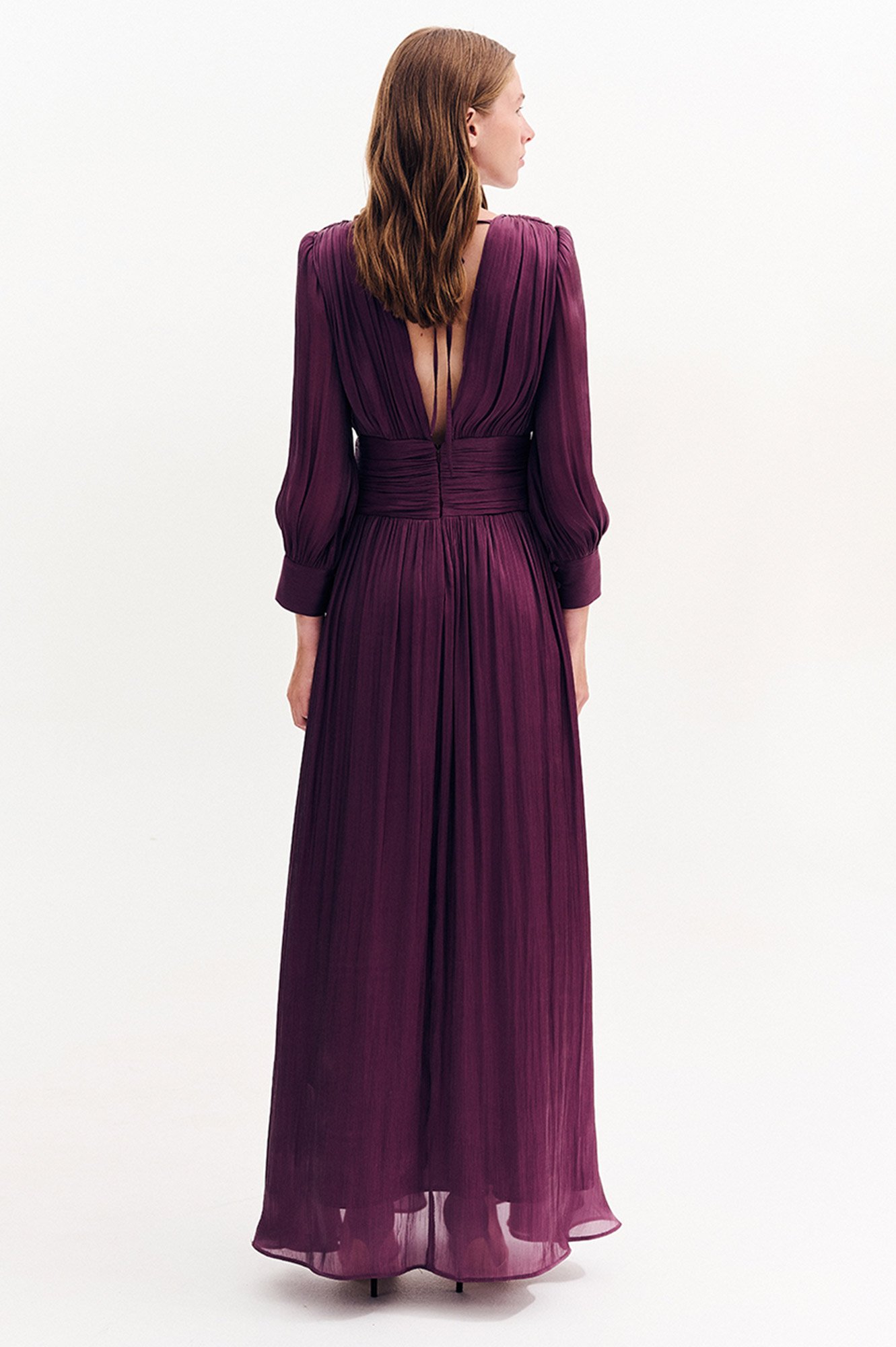 Φόρεμα satin μακρύ με στενή μέση. Μπούστο και πλάτη σε σχήμα V. Μακρύ μανίκι με άνοιγμα και δέσιμο. Λεπτομέρεια, σούρες στο μπούστο, στην μέση και διακοσμητικά κουμπάκια. Κλείσιμο με φερμουάρ στο πίσω μέρος.