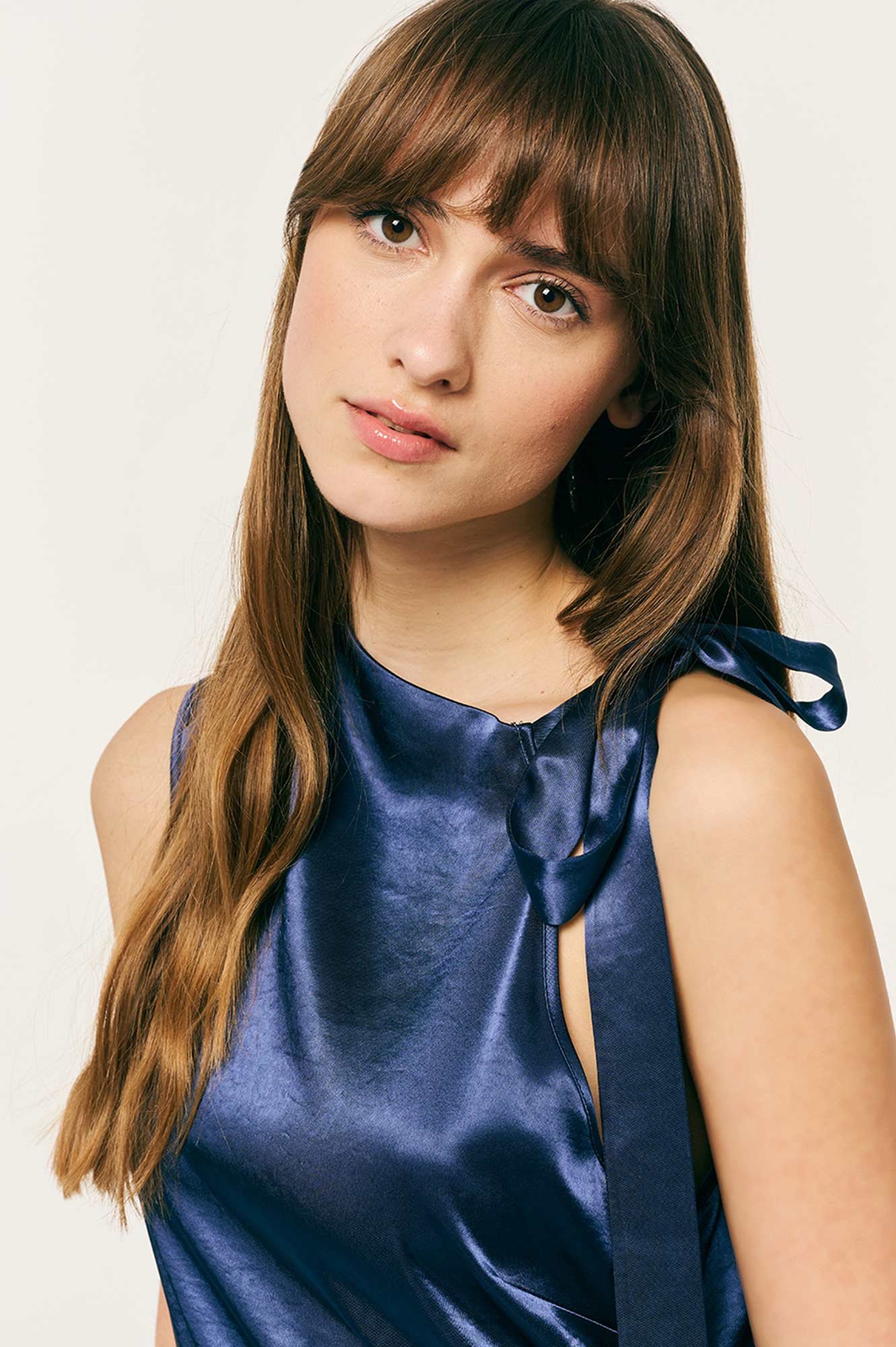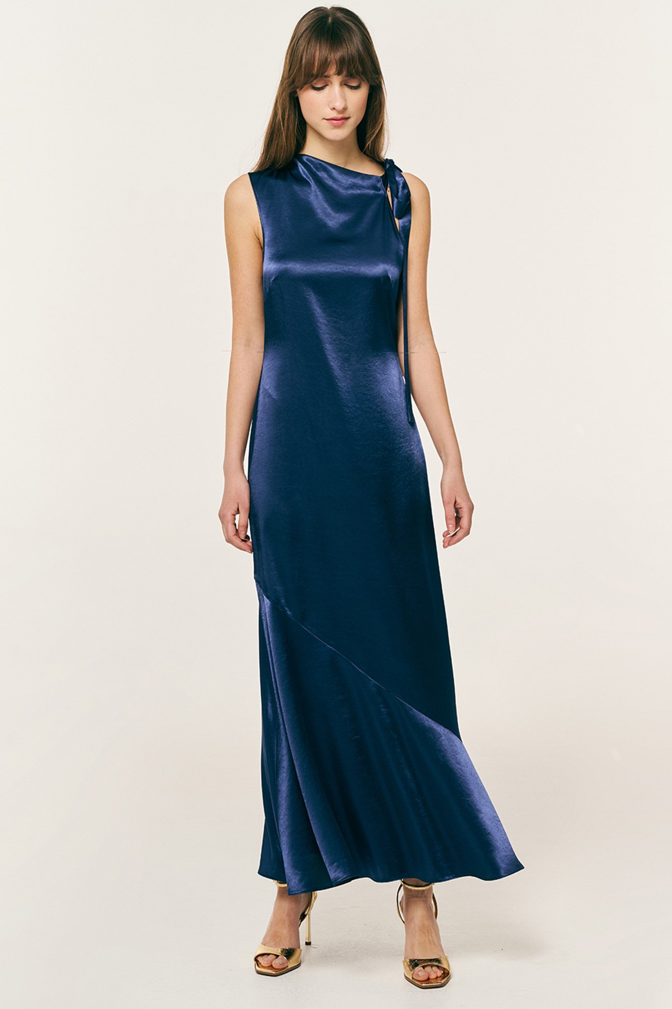Φόρεμα αμάνικο satin με δέσιμο στον ένα ώμο. Άνετη εφαρμογή και λεπτομέρεια βολάν στο τελείωμά του