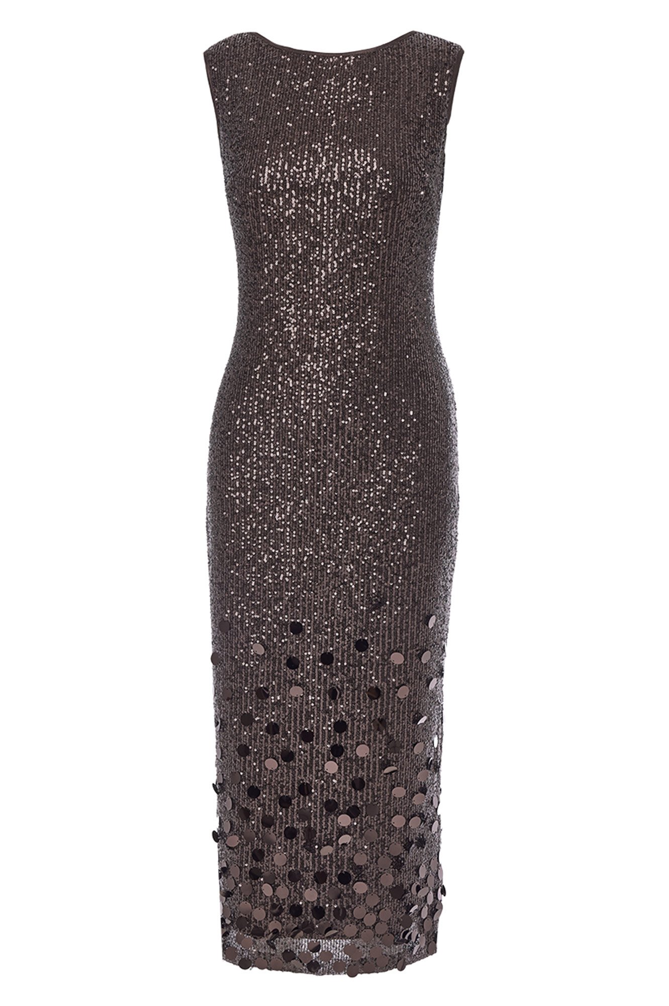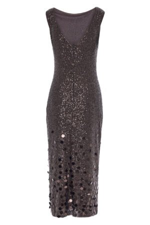 Φόρεμα αμπιγιέ με παγιέτα αμάνικο. Σε εφαρμοστή γραμμή, κλειστή λαιμόκοψη και V άνοιγμα στη πλάτη. Κλείσιμο πίσω με κρυφό φερμουάρ.
