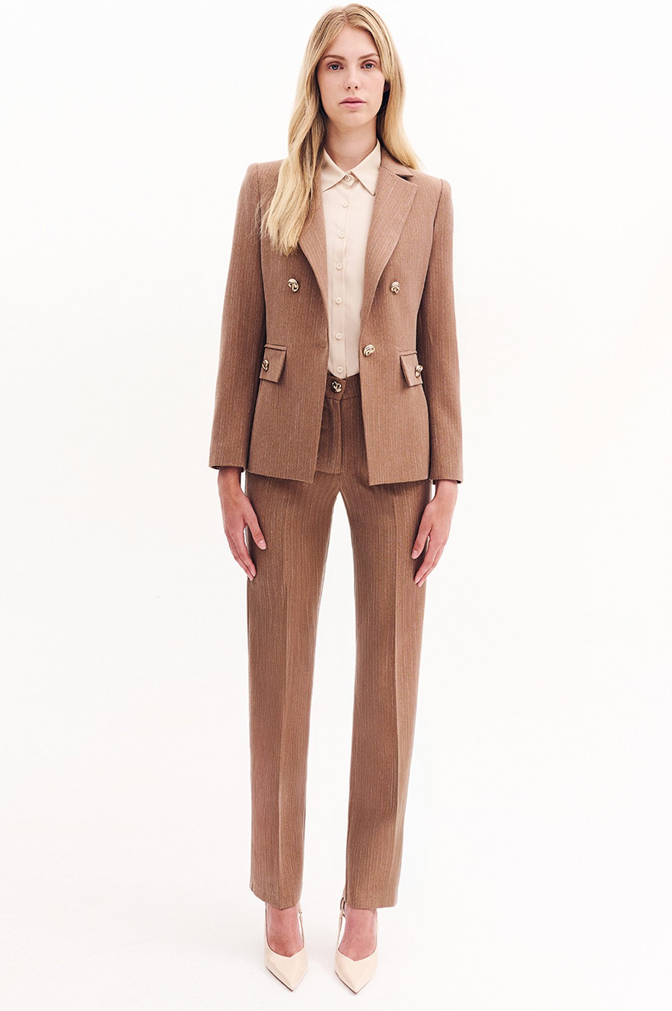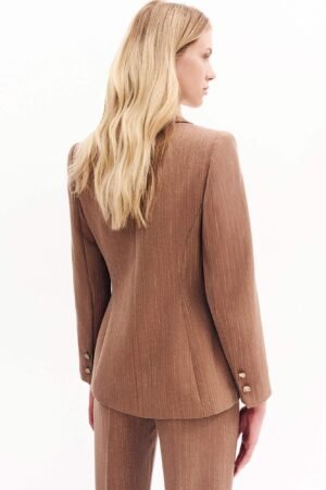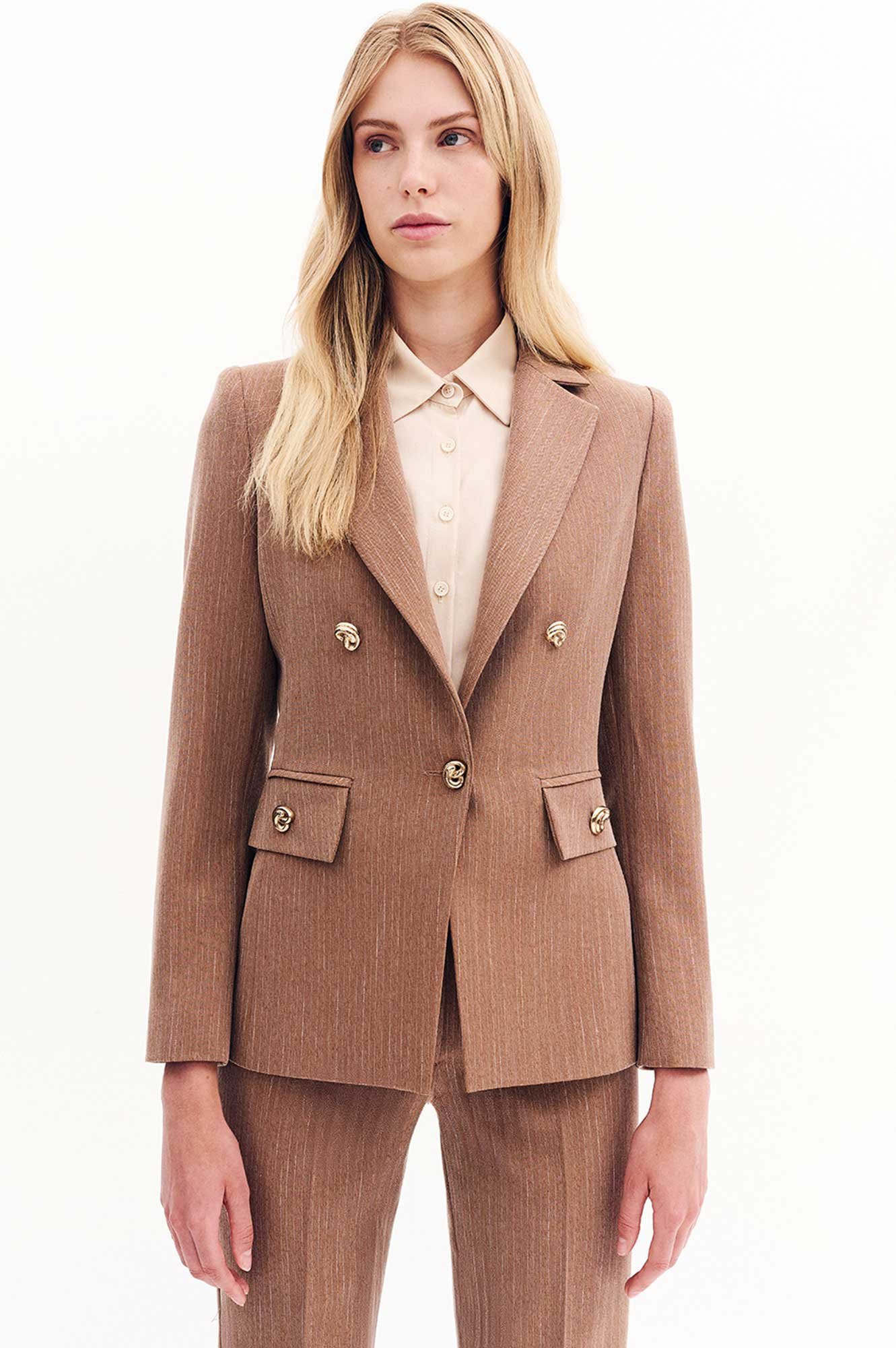 Σακάκι μεσάτο με λεπτή ρίγα. Γιακάς με πέτο και πατ τσέπες. Λεπτομέρεια, διακοσμητικά χρυσά κουμπιά