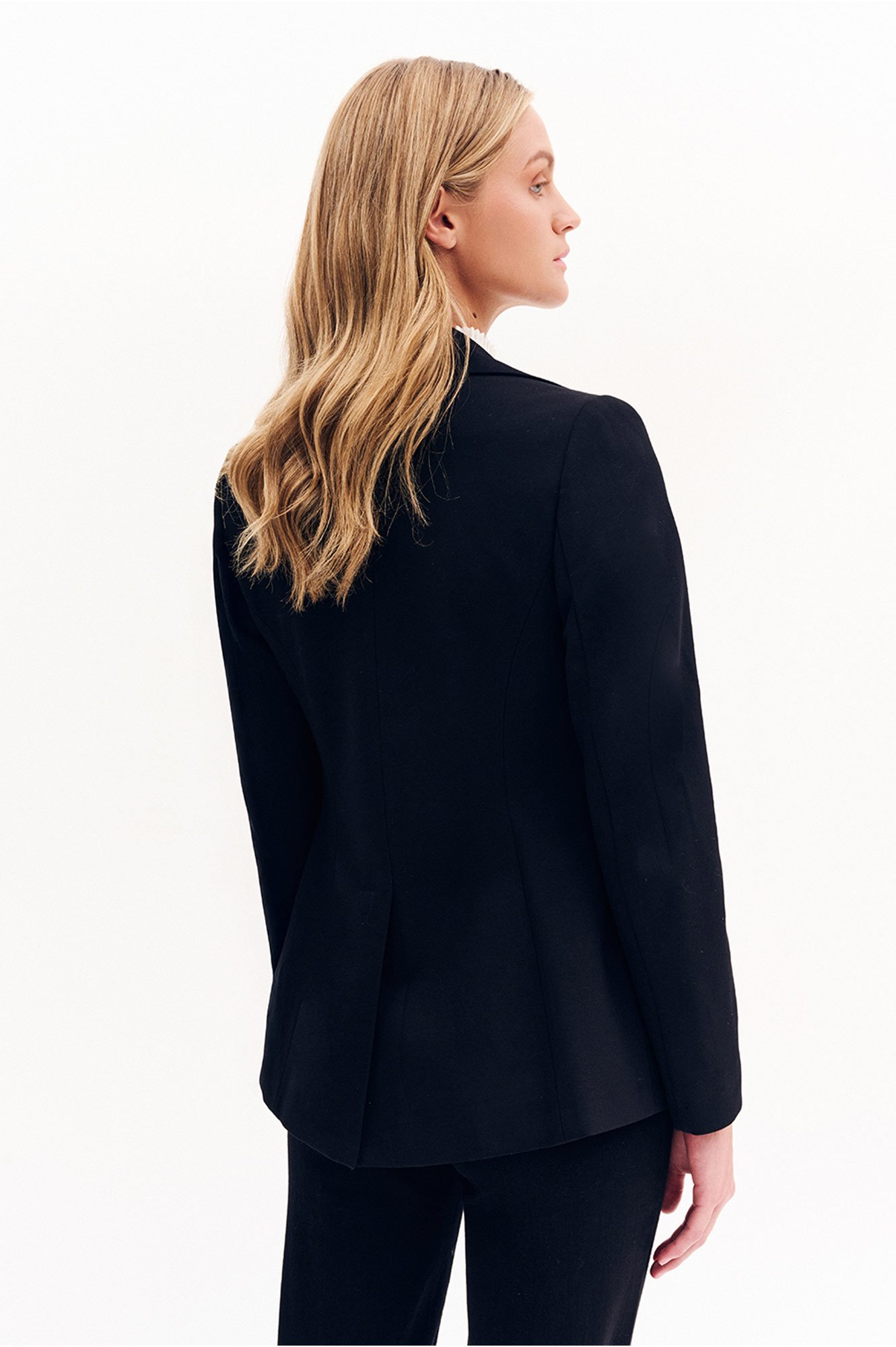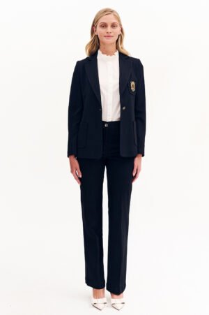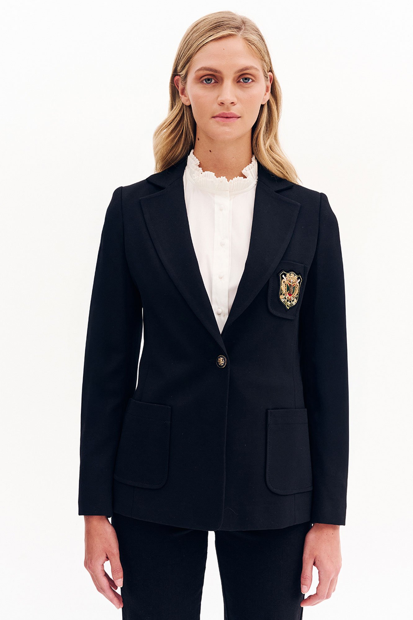 Σακάκι μεσάτο με τετράγωνες τσέπες. Γιακάς με πέτο και κλείσιμο μπροστά με κουμπί. Σκίσιμο στο πίσω μέρος, λεπτομέρεια, διακοσμητικό παράσημο.