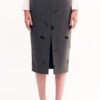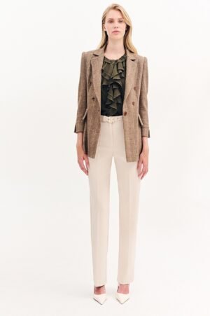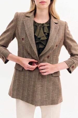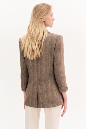 Σακάκι μεσάτο με ρίγα. Γιακάς με πέτο και πατ τσέπες. Κλείσιμο μπροστά με κουμπί.