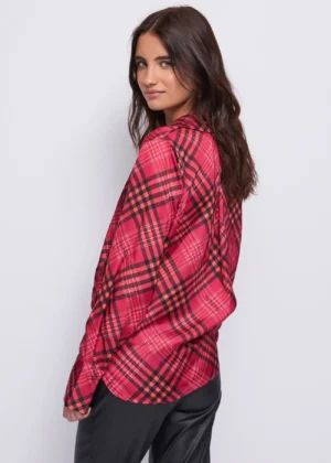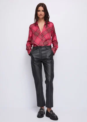 Κομψό σατέν πουκάμισο με all-over καρό print. Διαθέτει V λαιμόκοψη, μακριά μανίκια με κουμπωτές μανσέτες και κλείσιμο με καλυμμένα κουμπιά για διακριτικό φινίρισμα. Ιδανικό για σικ εμφανίσεις στο γραφείο ή στη βραδινή έξοδο.