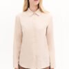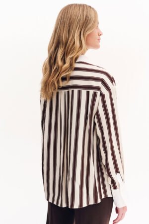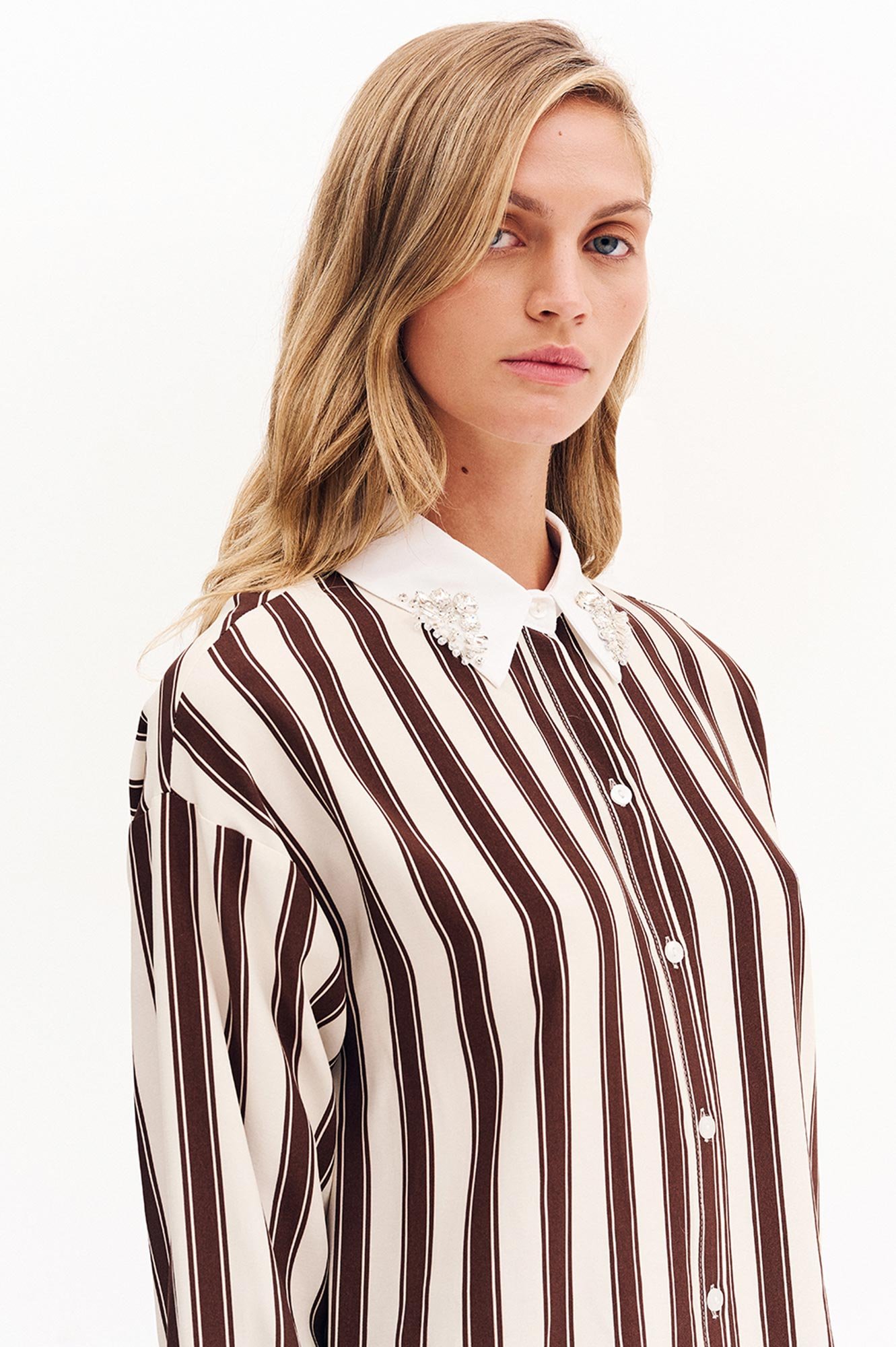 Πουκάμισο με ρίγες, διχρωμία σε γιακά και μανσέτες. Με λεπτομέρεια, strass στον γιακά και κλείσιμο με κουμπιά μπροστά.
