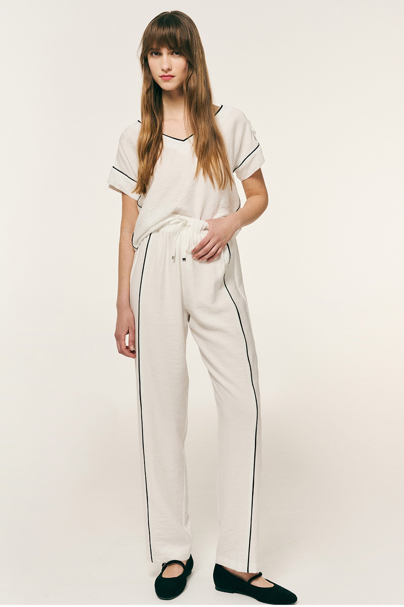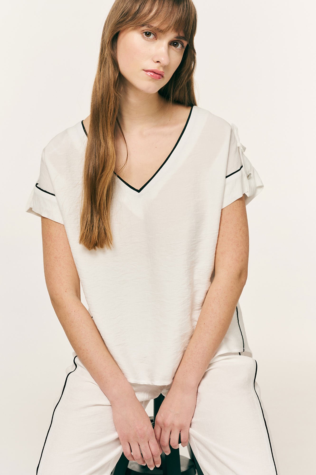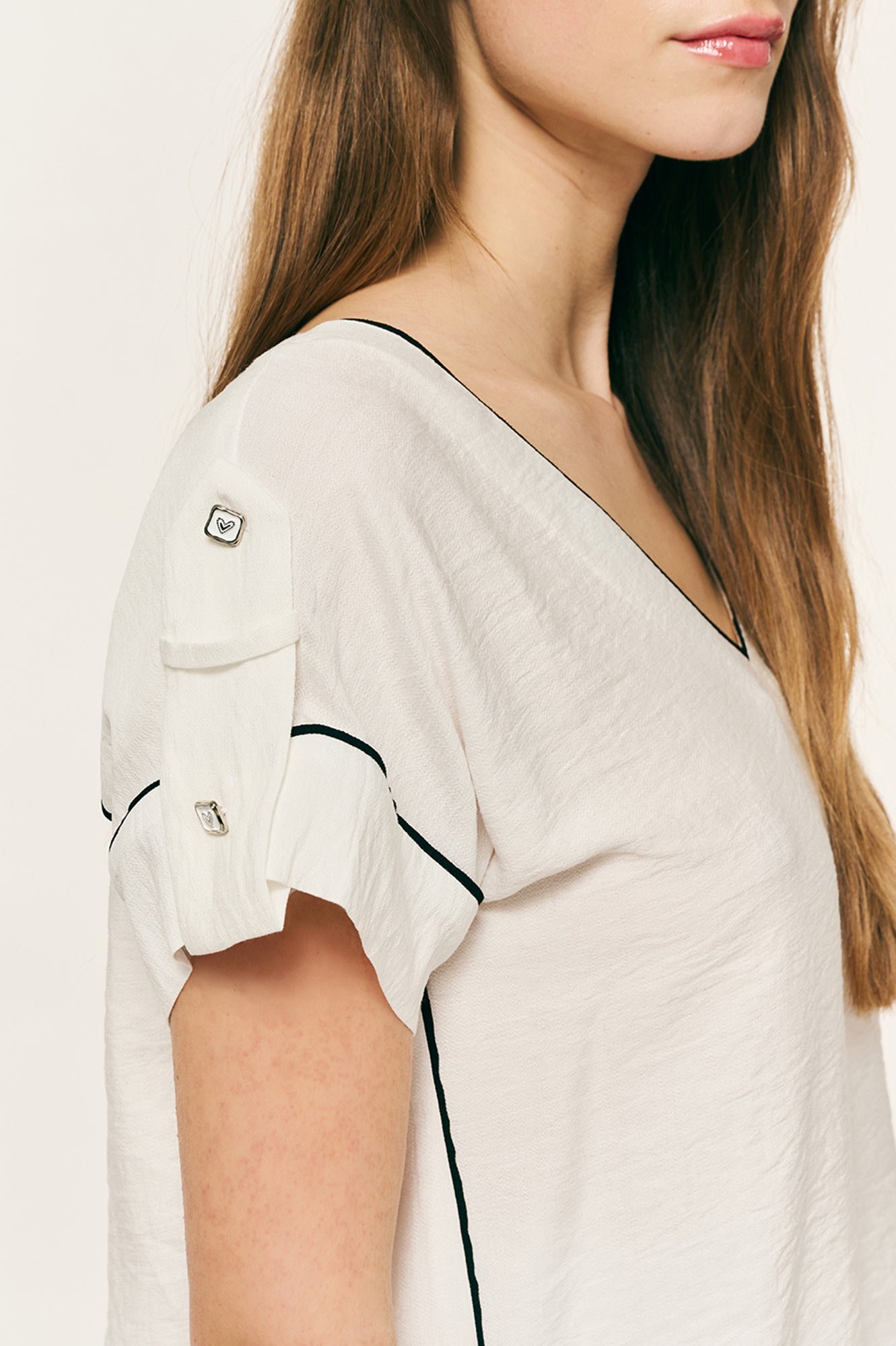 Μπλούζα κοντομάνικη με διχρωμία στο ρέλι, σε “V” λαιμόκοψη.