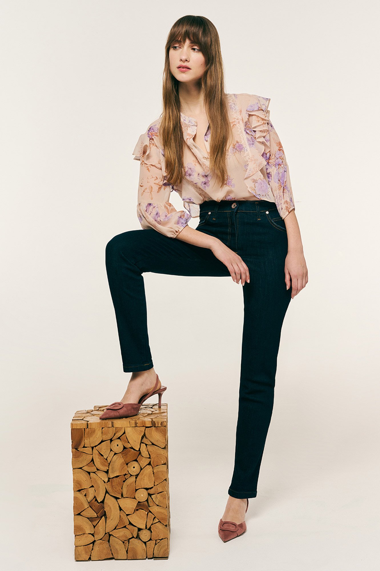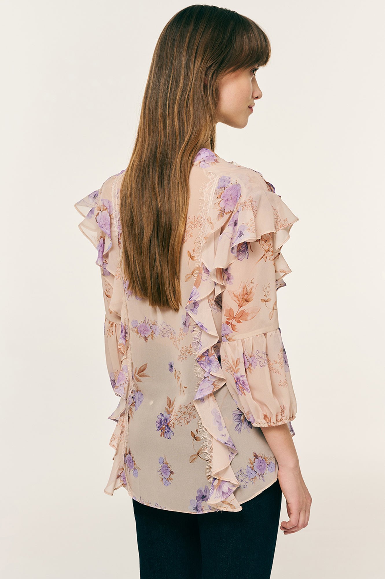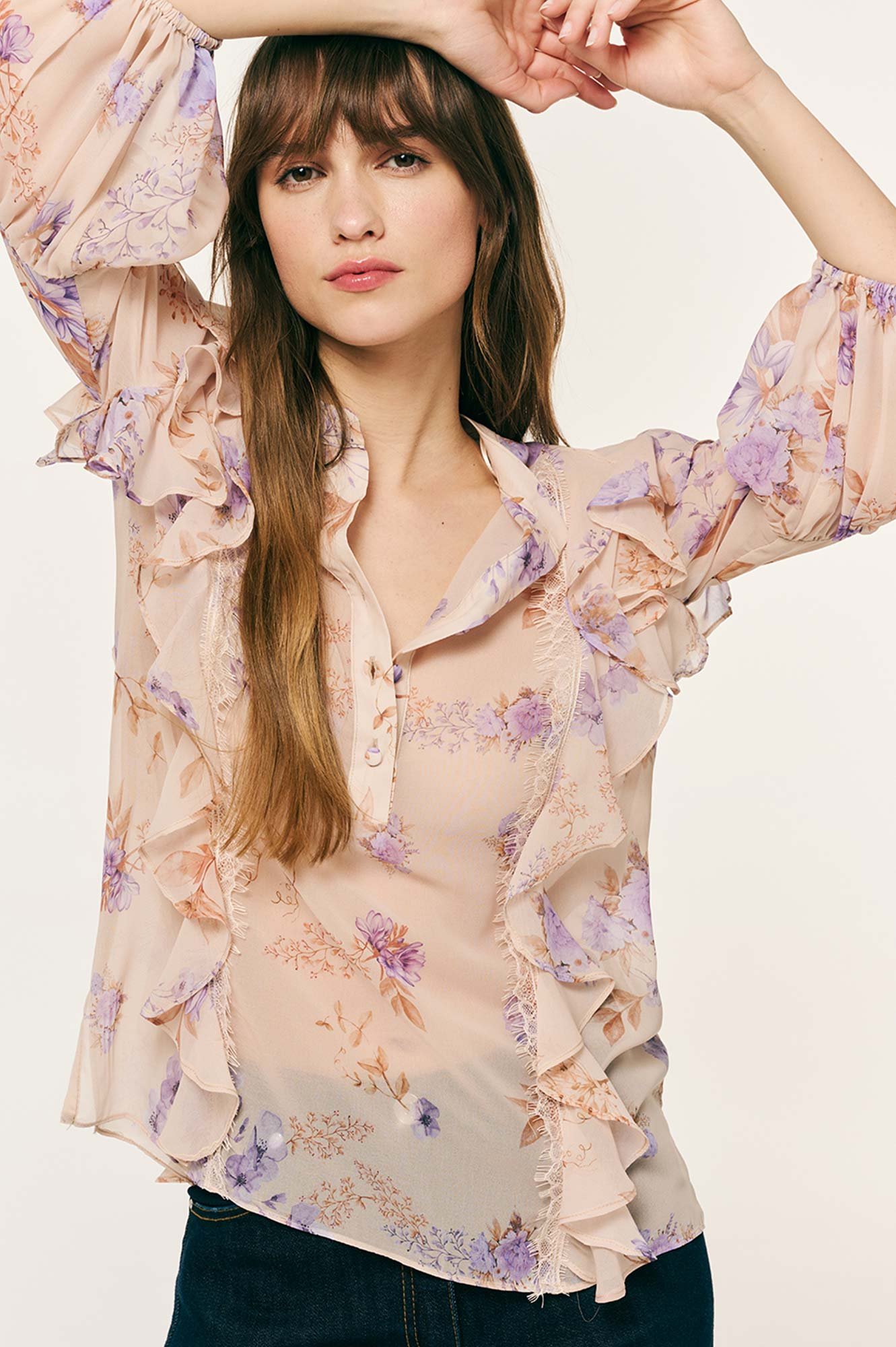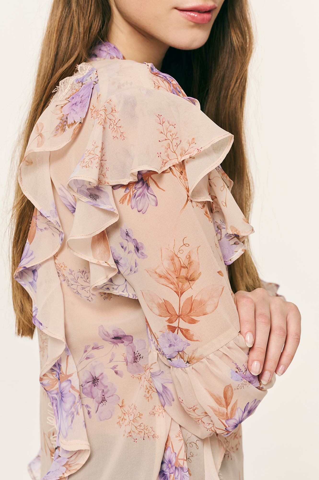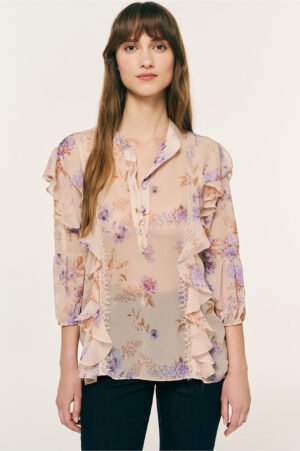 Μπλούζα με μοτίβο λουλουδιών και βολάν κατά μήκος και στους ώμους