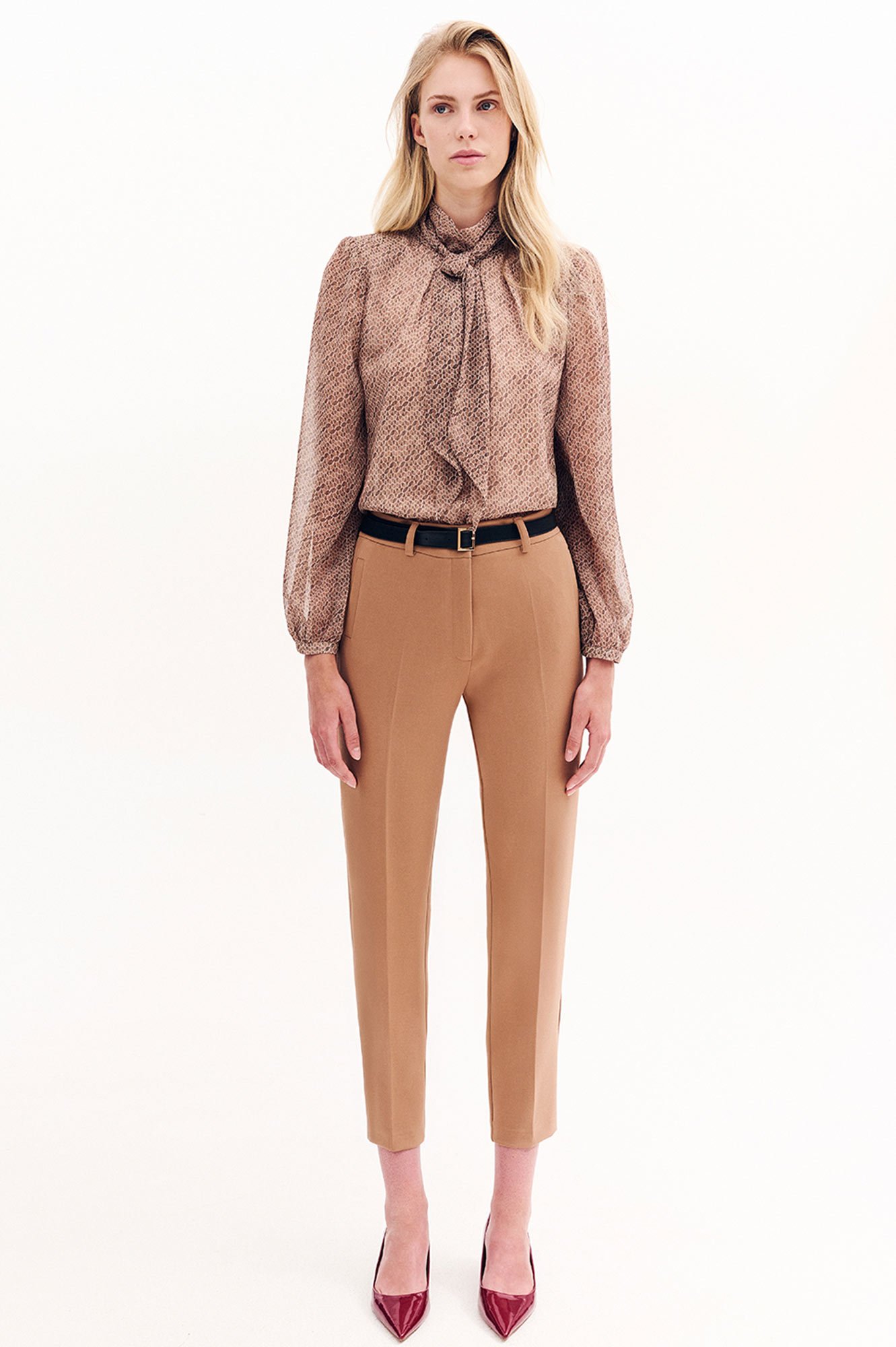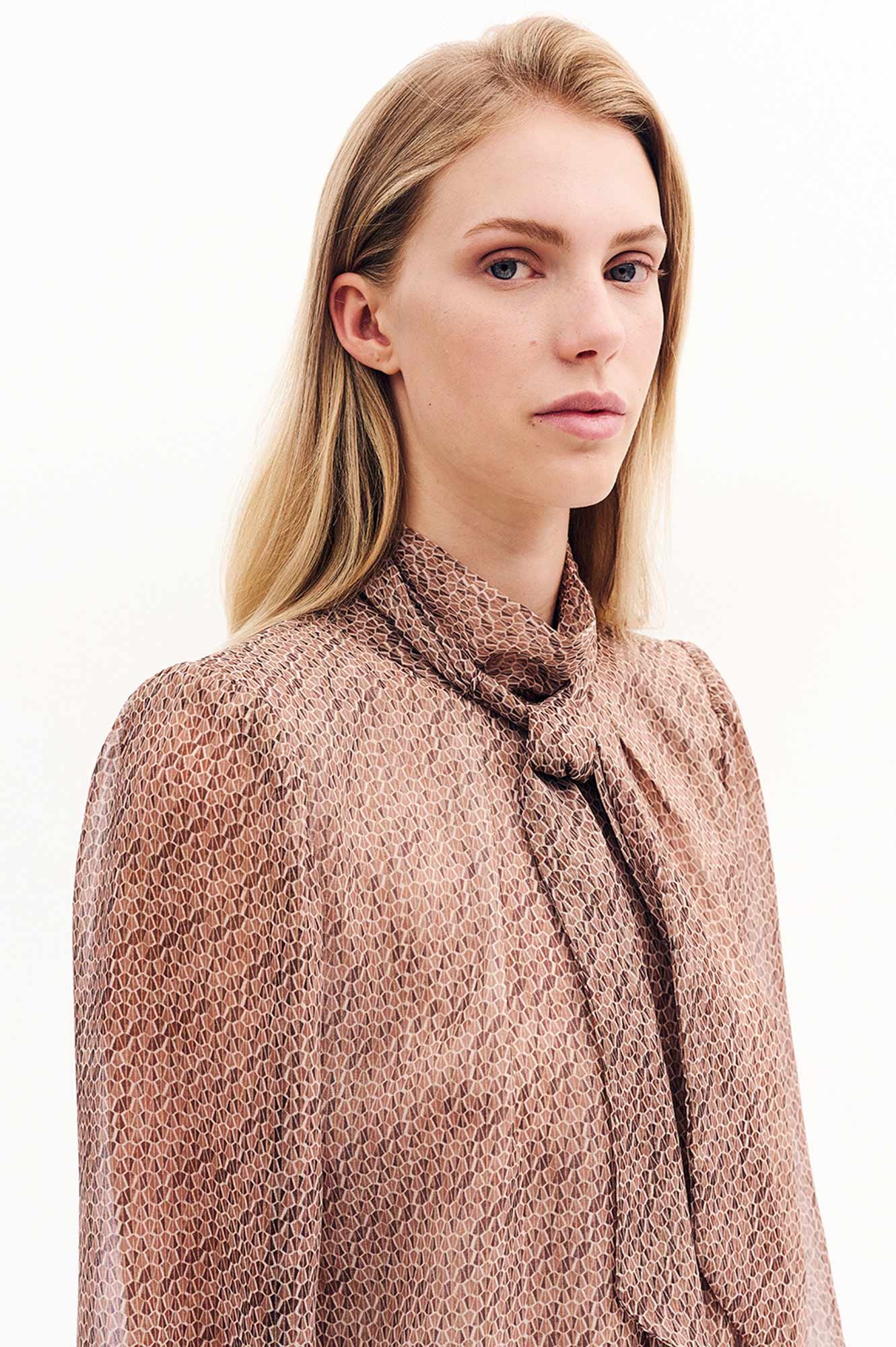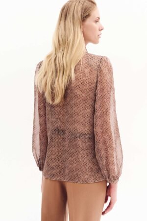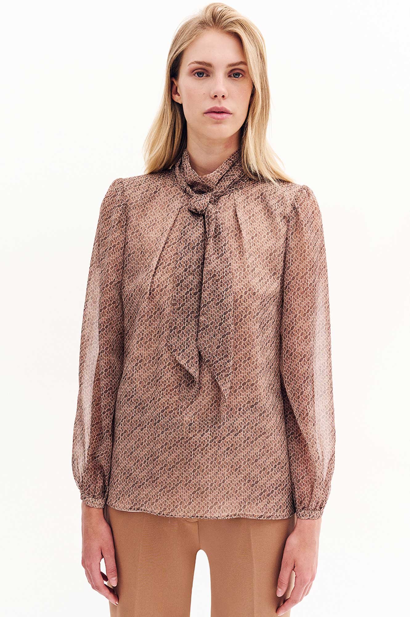 Μπλούζα με ψηλό λαιμό εμπριμέ. Βάτες στον ώμο και φαρδύ μανίκι με σούρες στο τελείωμα. Λεπτομέρεια, γραβάτα στο ίδιο ύφασμα