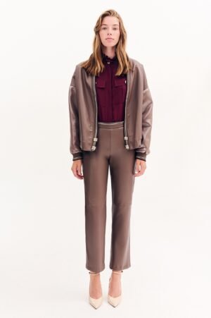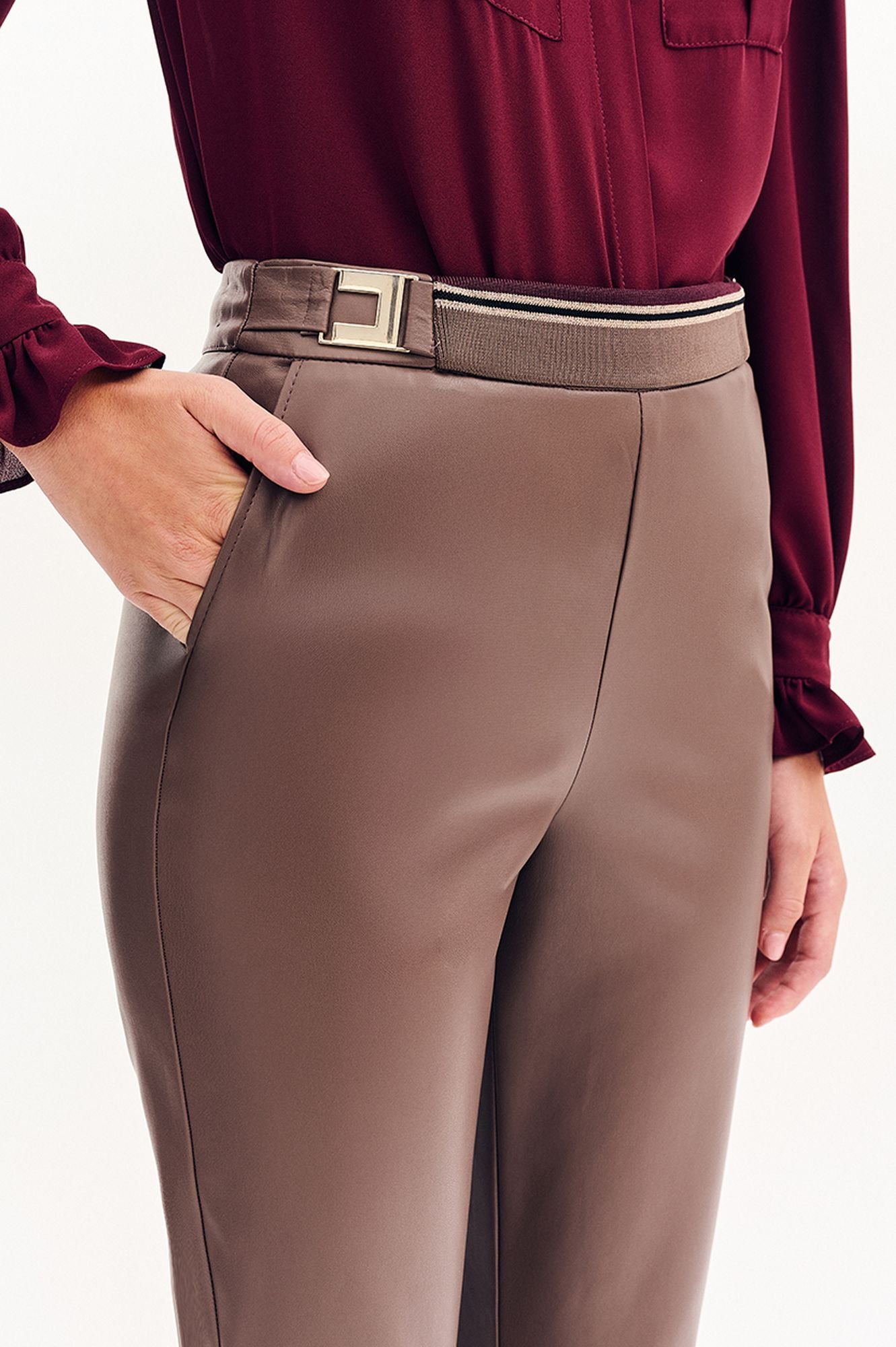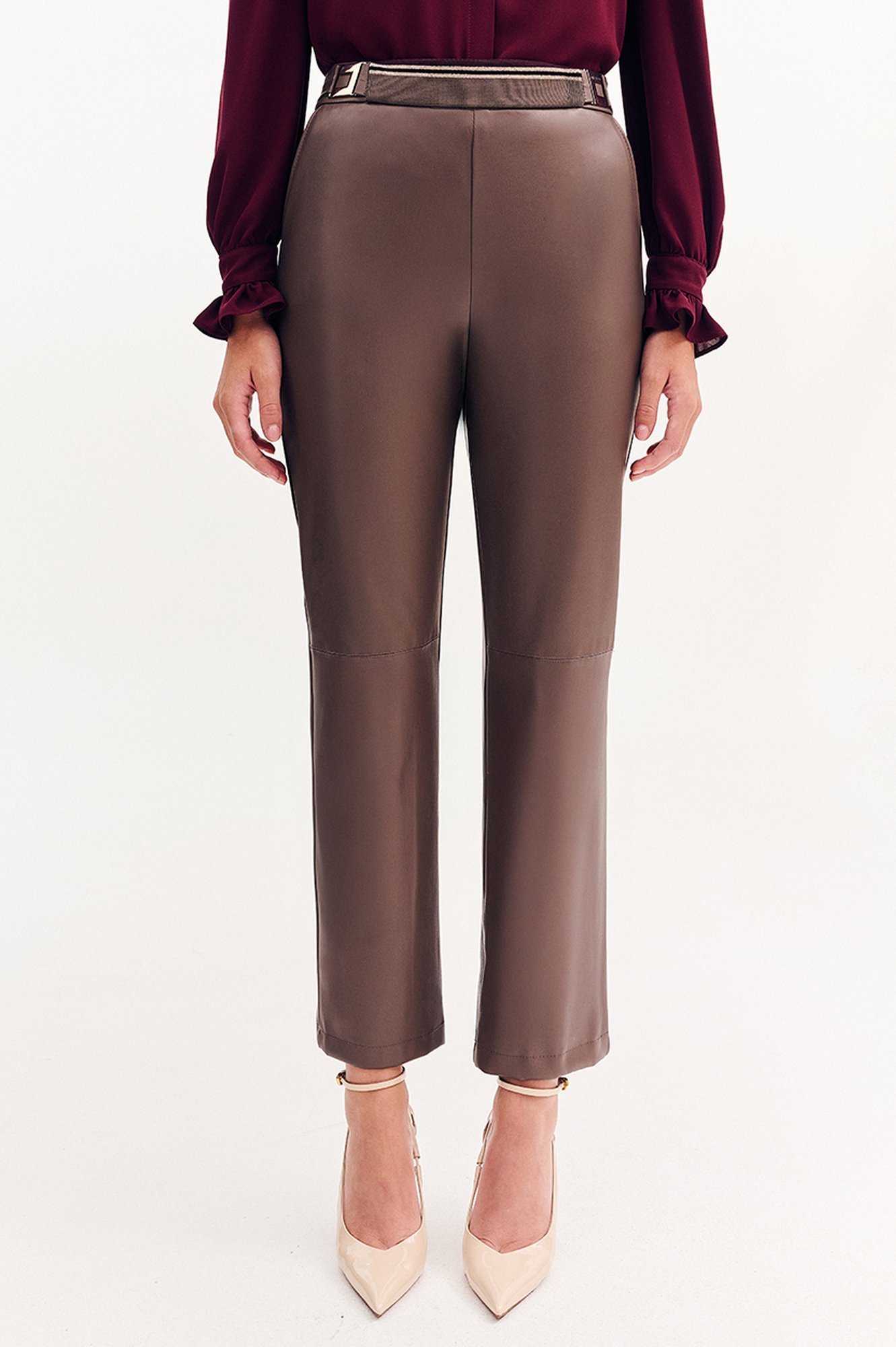 Παντελόνι δερματίνη σε cigarette γραμμή, με διακοσμητικές χρυσές αγκράφες στο μπροστινό μερος. Κοφτές τσέπες μπροστά και κλείσιμο στο πλάι με φερμουάρ.