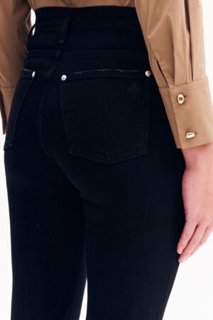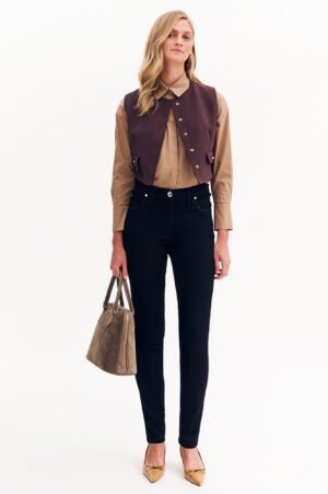 Παντελόνι τζιν ψηλόμεσο σε στενή γραμμή. Πεντάτσεπο σε ελαστικό βαμβακερό ύφασμα. Κλείσιμο μπροστά με φερμουάρ και μεταλλικό κουμπί.