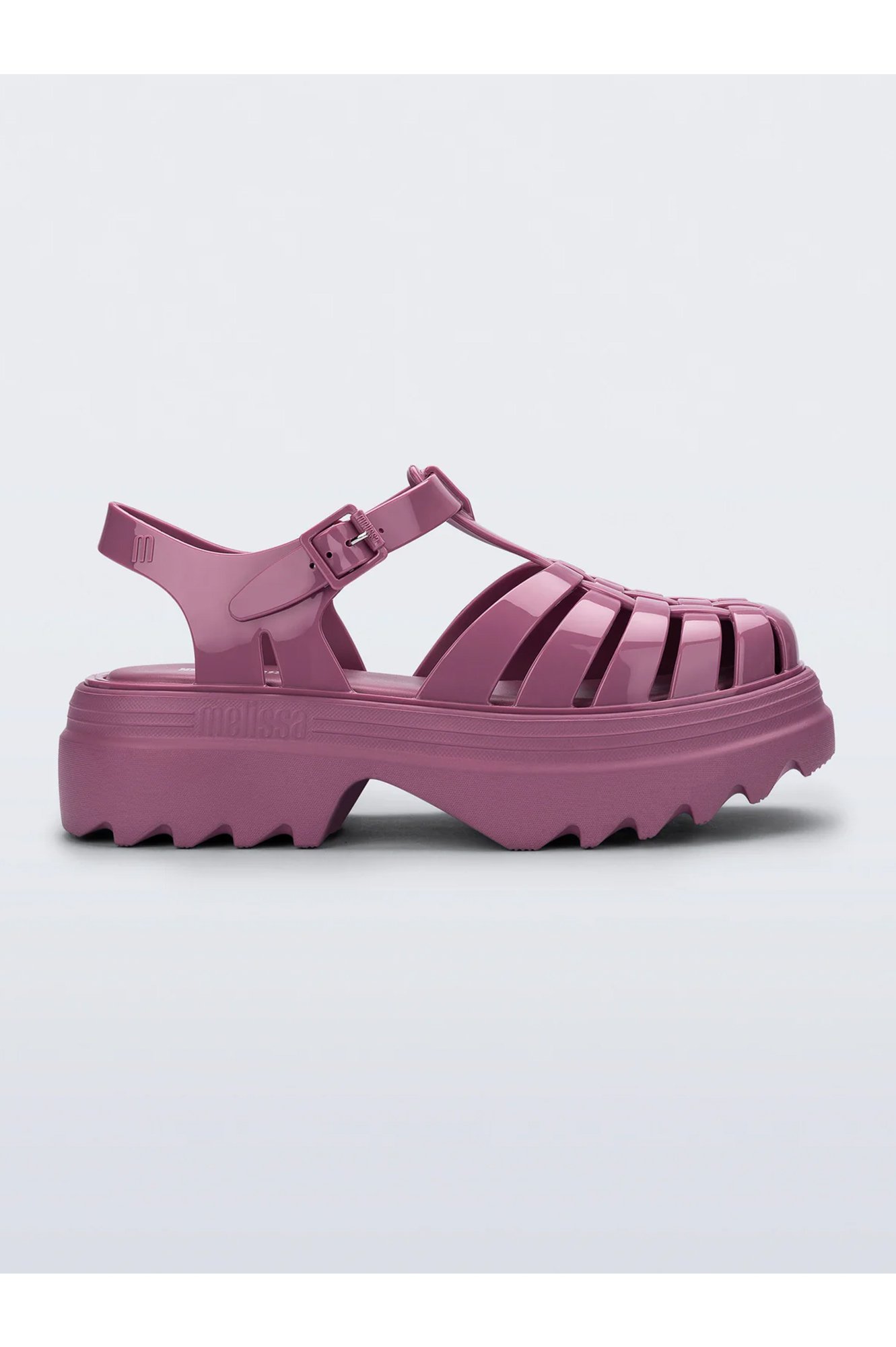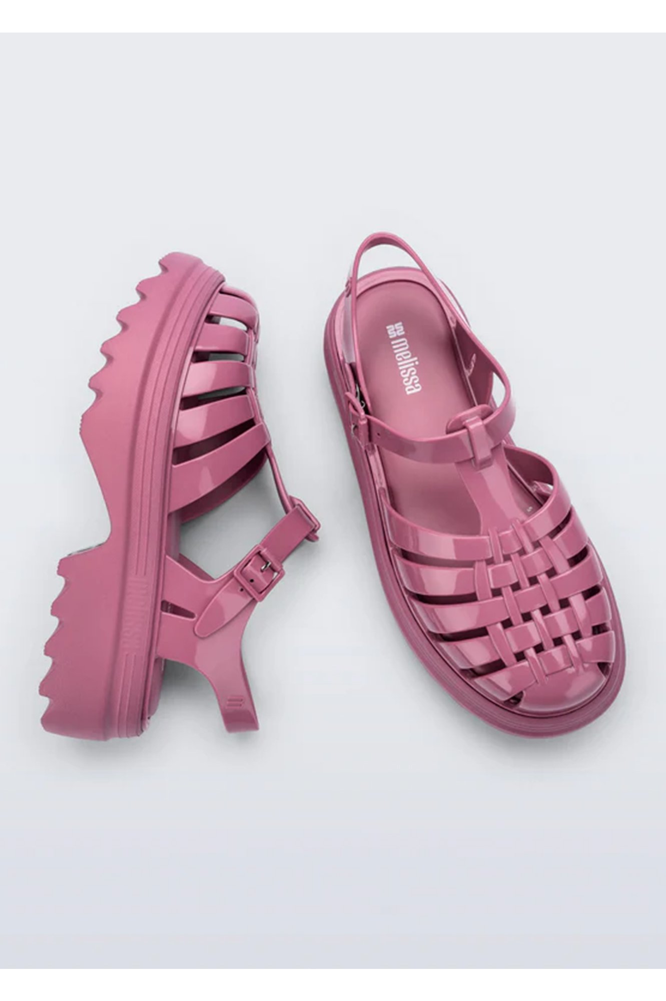 Σανδάλια με στρογγυλή μύτη και ορθογώνιο τακούνι κατασκευασμένα από αρωματισμένο, μοναδικό υλικό Mel-flex – ένα μείγμα πλαστικού και καουτσούκ με το χαρακτηριστικό άρωμα τσίκλας